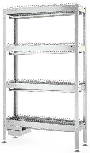 Каркас, основание полок, кассеты для тарелок и стаканов имеют различные варианты конструкции и материалов. Полка - AISI304, каркас — AISI430.