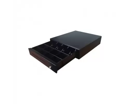 Горизонтальный механический денежный ящик. 4 отделения для банкнот, 8 для монет. Вынимающийся лоток. Зажимы металлические. Габариты ящика 350х405х90 мм.